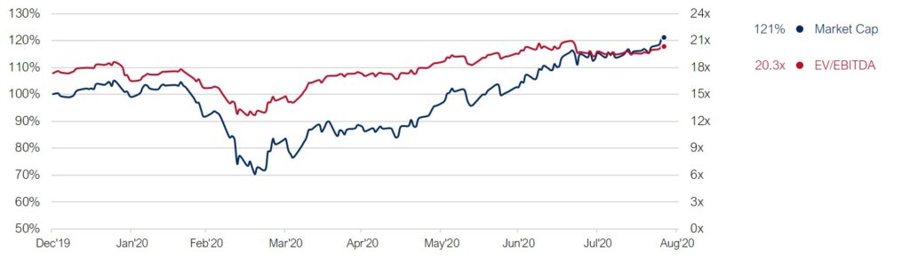 Industrie Software Multiplikatoren liegen heute bei 20x EBITDA, 17% höher als vor COVID-19.