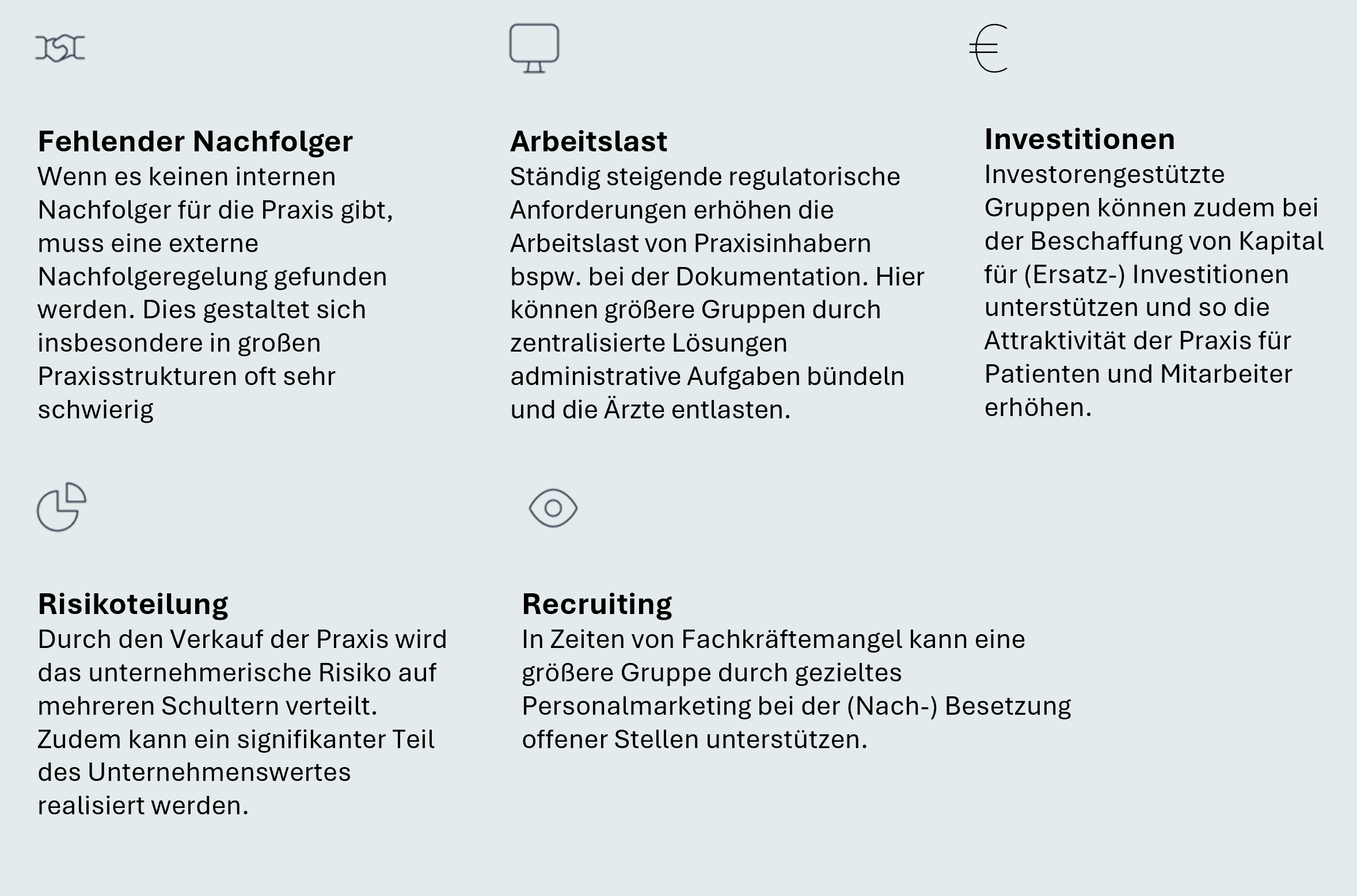 In vielen Facharztbereichen sind heute bereits von Investoren finanzierte Gruppen aktiv und konsolidieren den Markt. Diese bezahlen in der Regel einen (deutlich) attraktiveren Preis für die Praxis als andere Ärzte könnten und bieten darüber hinaus Unterstützung in vielen administrativen Bereichen. Die Versorgung der Patienten jedoch obliegt weiterhin vollständig den Ärzten.