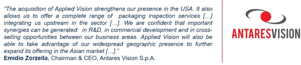 US-based Applied Vision has gained a leading position for MV systems for the Food & Beverage industry with high-speed vision inspection systems for glass and metal containers. This acquisition allows Antares to further execute its strategy of expanding its technological leadership to encompass the entire spectrum of inspection process services and at the same time to expand its geographical penetration, especially in the USA. In terms of industry sector expertise, this deal is in line with the acquisition of FT System (Nov ’19).