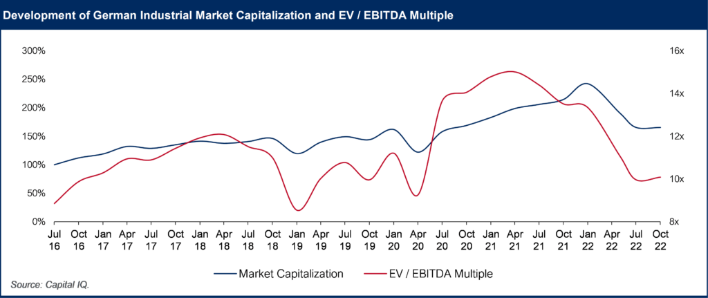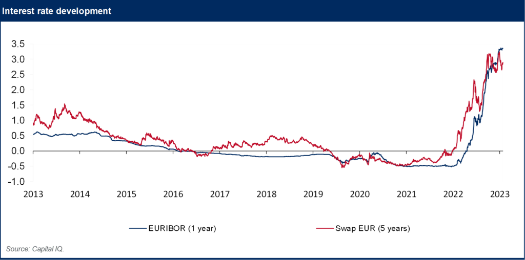 The rise of geopolitical risks, commercial uncertainty and cautious capital markets are reflected in weaker corporate forecasts, which lead to a decrease in corporate valuations (multiples) and poorer corporate ratings. In the capital markets, interest rates have reached levels not seen for more than one decade based on a combination of rising central bank rates and higher risk premiums for corporate loans.