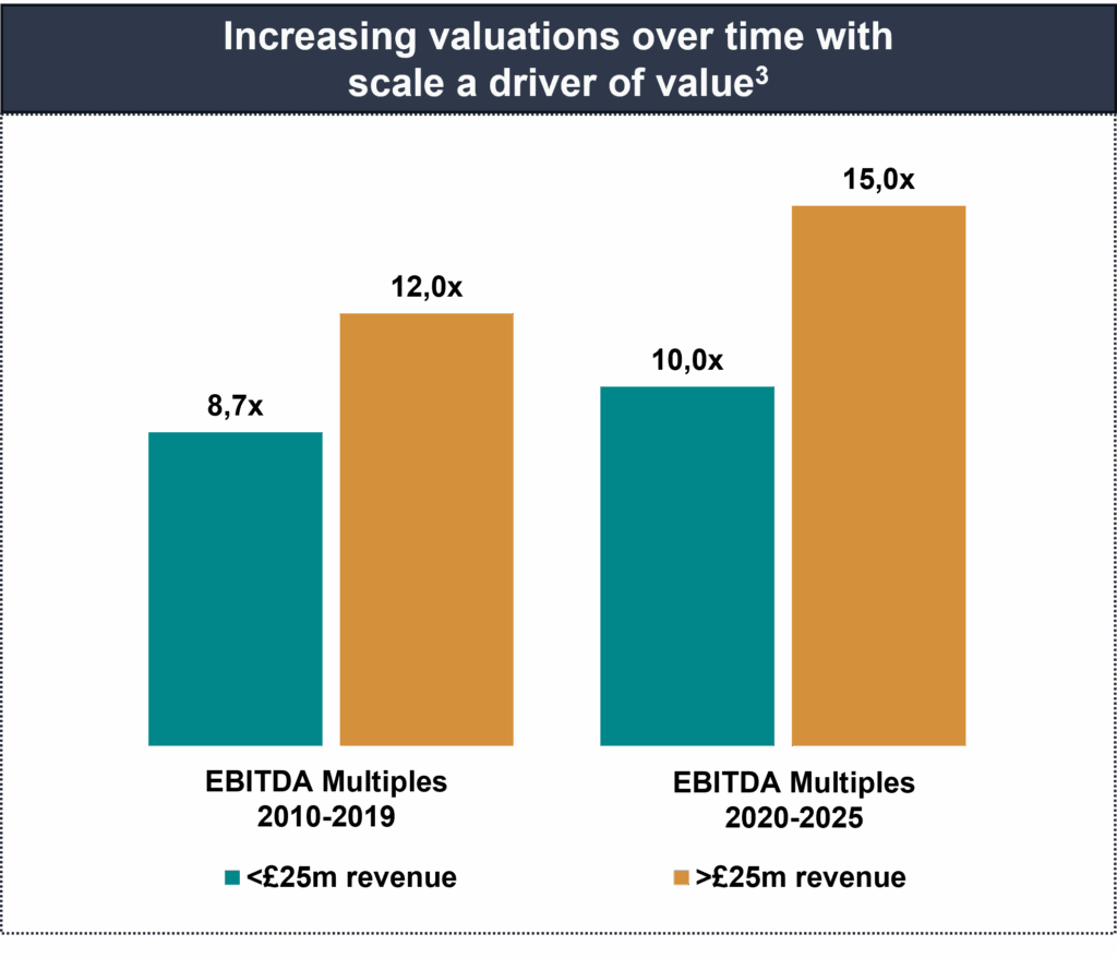 While M&A volumes in the sector have continued to grow, the TIC sector has seen an increase in acquisition valuations – across both <£25m and >£25m revenue TIC companies. Key drivers over the past 5 years include continued activity by larger private equity backed and listed consolidators as well as ongoing, high levels of investment by private equity into the sector – driving EBITDA multiples to c.15.0x for scaled TIC providers: