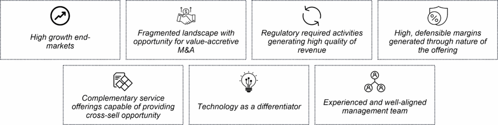 Key drivers of value in recent processesRecent transactions in the sector have highlighted several key themes as drivers of value, including i) underlying market growth dynamics, ii) differentiation leading to high, defensible margins, and iii) the ability to drive growth through M&A and complementary service offerings – driving cross sell: