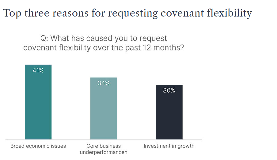 Some 87% of respondents say they have gone to lenders to request covenant flexibility for one or more portfolio companies. Broad economic issues (cited by 41%) and business underperformance (cited by 34%) are the main reasons for requesting flexibility.