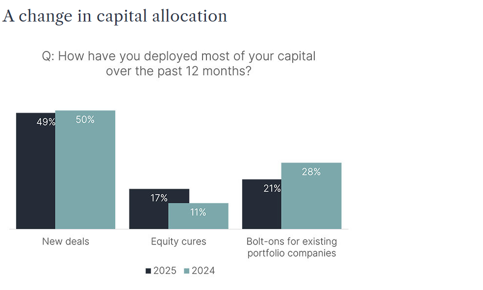 Less than half of GPs (49%) have deployed most of their capital in new deals during the past 12 months, with just over a fifth (21%) focusing efforts on smaller bolt-on acquisitions to support buy-and-build portfolios – down from 28% in our previous survey. An increase in the number of GPs deploying most of their capital in equity cures – up to 17% from 11% last year – further highlights the tough backdrop for managers during the past year.