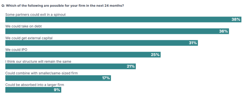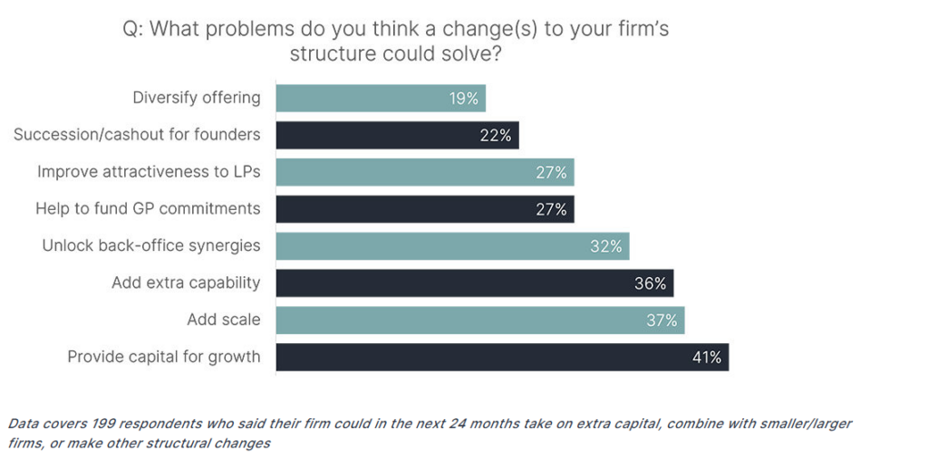 According to Pitchbook figures, GP-to-GP M&A reached record highs at the end of 20249 and the survey points to a long runway of further deals, with 79% of respondents expecting some kind of change to their firm’s structure.