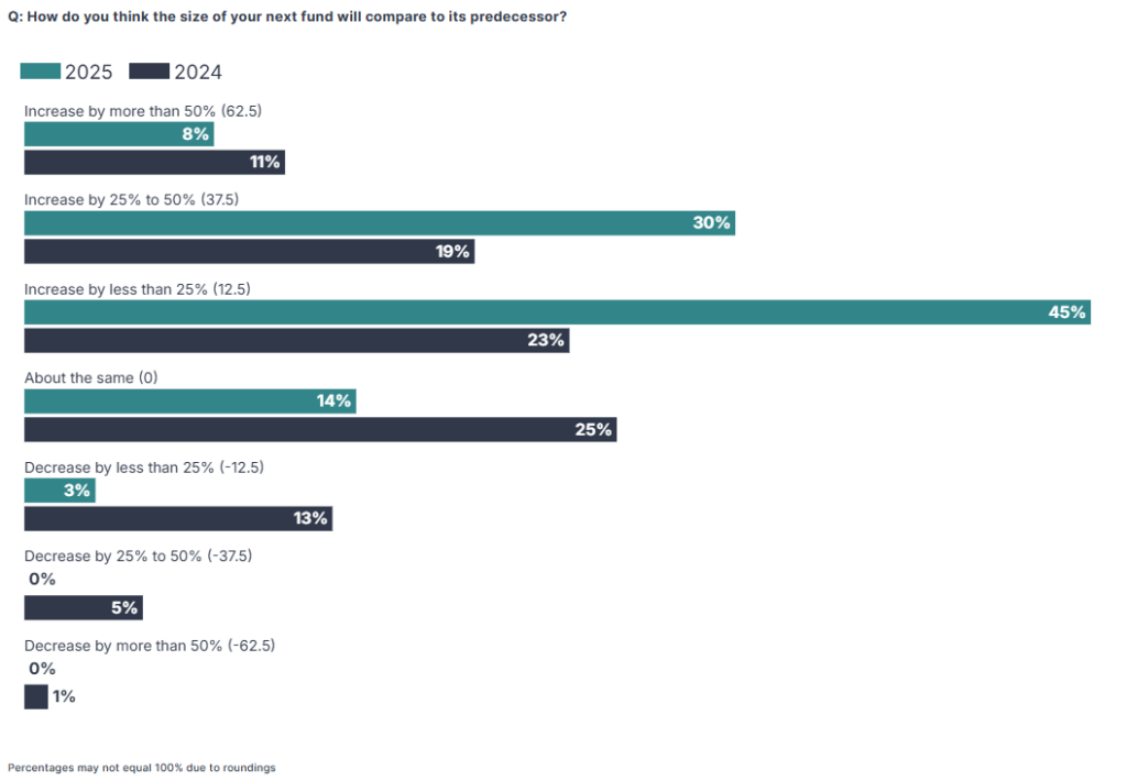 There is also a large cohort of super-optimists – 38% expect their next raise will be a blockbuster increase of 25% or more over their previous fund.