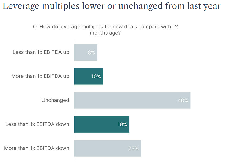 Despite these expectations, lenders are remaining disciplined. Well over a third of respondents (43%) report that leverage multiples have lowered from a year ago.