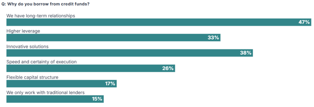 More than half (54%) of GPs say they will have new lenders to work with in 2024. This marks a shift from last year’s findings, when 56% of respondents saw a contraction in new lender activity. The majority of GPs who took part in our survey are working with credit funds and the top three reasons cited for working with a private credit included higher leverage levels and innovative financing solutions.