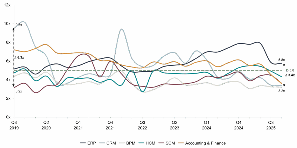 • ERP currently shows the highest revenue multiple at 5.8x, trading above the overall average and illustrating continued investor confidence in core platforms, supported by high customer stickiness and resilient margins.