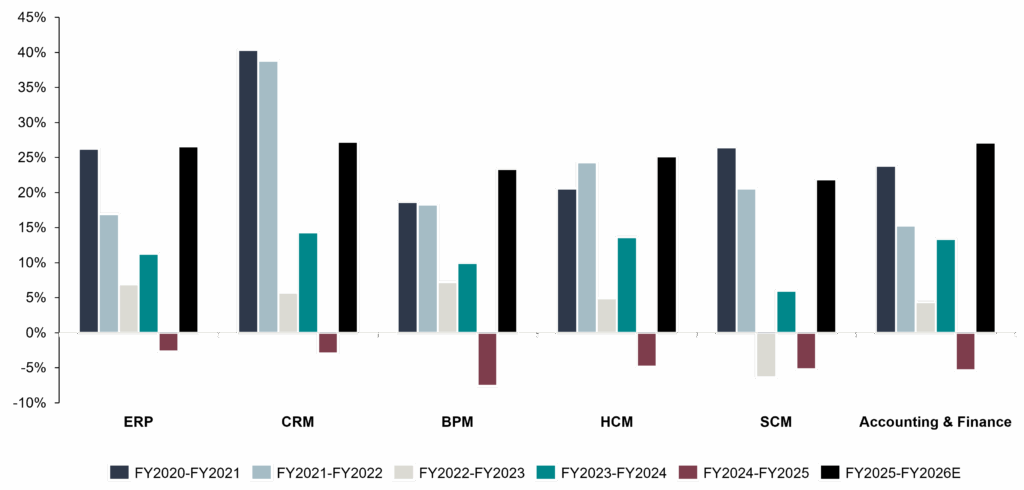 It’s a two-speed market: fast-growing sub sectors (CRM, HCM, A&F) lead the pack, while foundational platforms (ERP, SCM, BPM) show steadier, more cyclical growth.