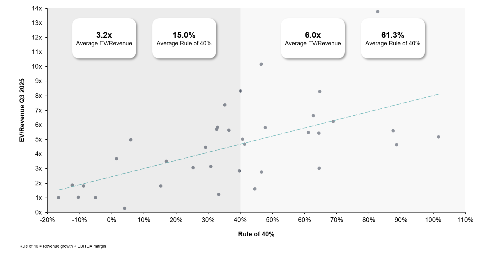 • In contrast, companies exceeding the 40% benchmark achieve significantly higher valuations, averaging 6.0x EV/Revenue with a strong 61% Rule of 40 performance.