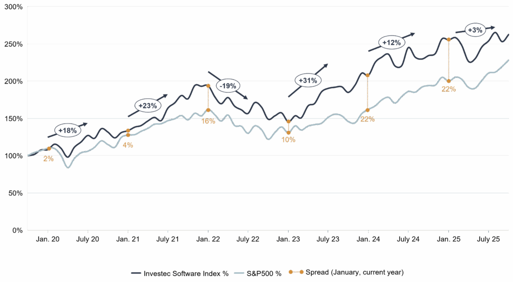 • The Investec Software Index has consistently outperformed the S&P 500, reflecting not only the sector’s superior long-term growth profile but also the resilience of sticky, recurring-revenue models and stable margins, particularly in periods of macro uncertainty such as COVID-19